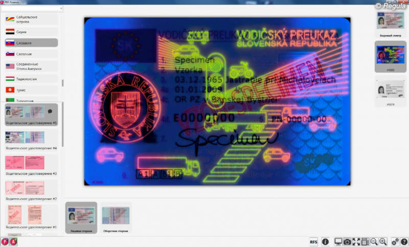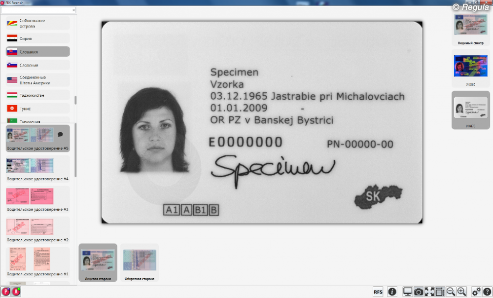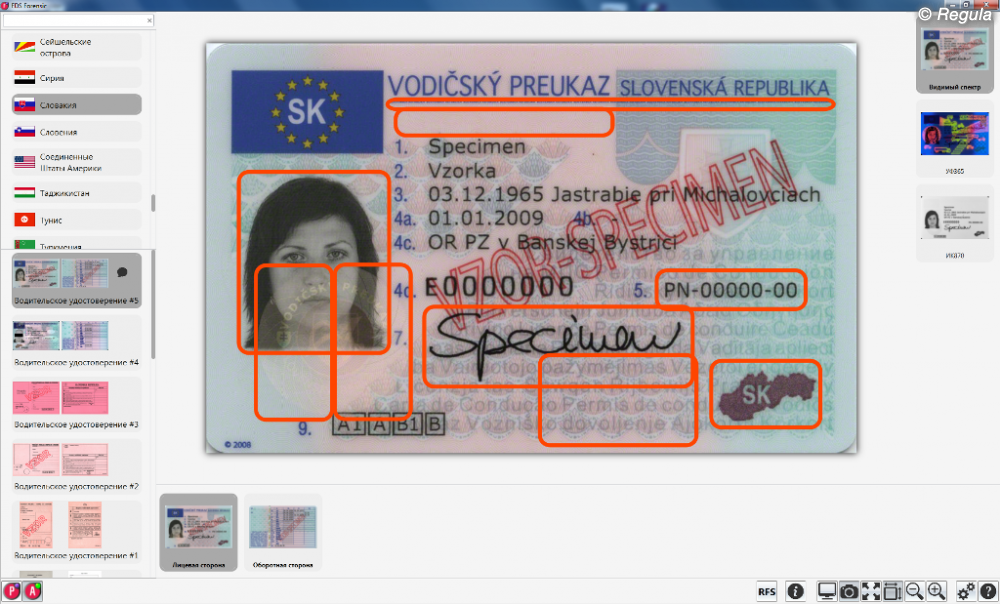 • Возможность выбора объема предоставляемой информации • Наличие в версиях Forensic/Forensic Pro gif-анимации оптически переменных элементов защиты: голограмм, OVI-элементов • Быстрая и удобная система поиска • Возможность добавления: - собственных описаний и примечаний к существующим документам - изображений и описаний новых документов с использованием программного модуля «Document Builder» в версии Forensic Pro • Интеграция с программным обеспечением «Regula Forensic Studio» для обработки изображений, сравнительного анализа: использование изображений документов и их фрагментов в качестве эталонных • Многоязыковой интерфейс: - английский - арабский - венгерский - испанский - итальянский - китайский - латышский - литовский - немецкий - польский - португальский - русский - украинский - французский - любой иной по требованию заказчика • Автоматическое обновление при наличии подключения к сети Интернет • Дистанционное обучение работе с системой • Дружественный интерфейс