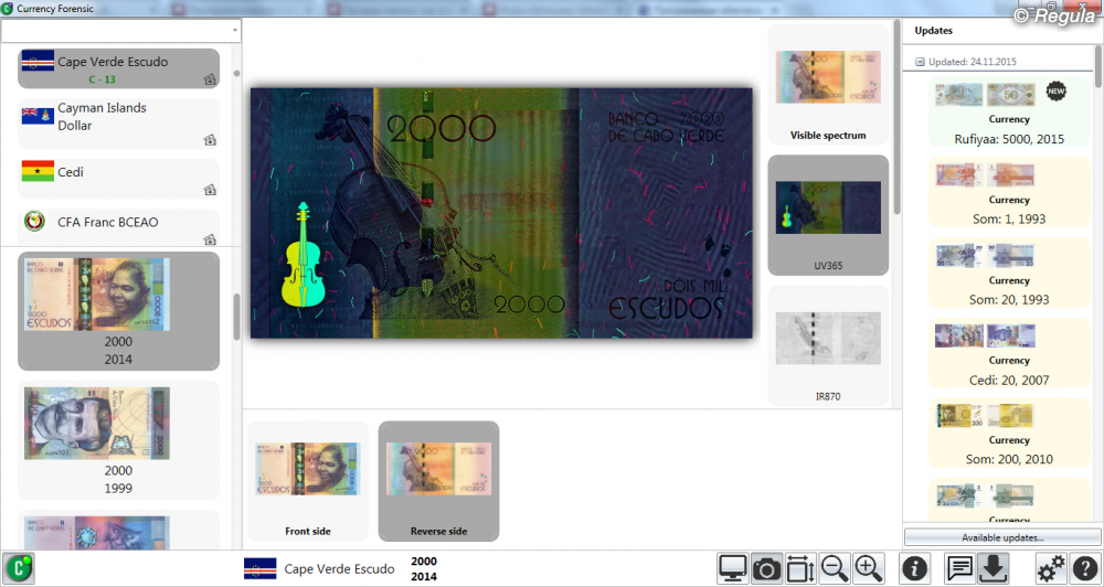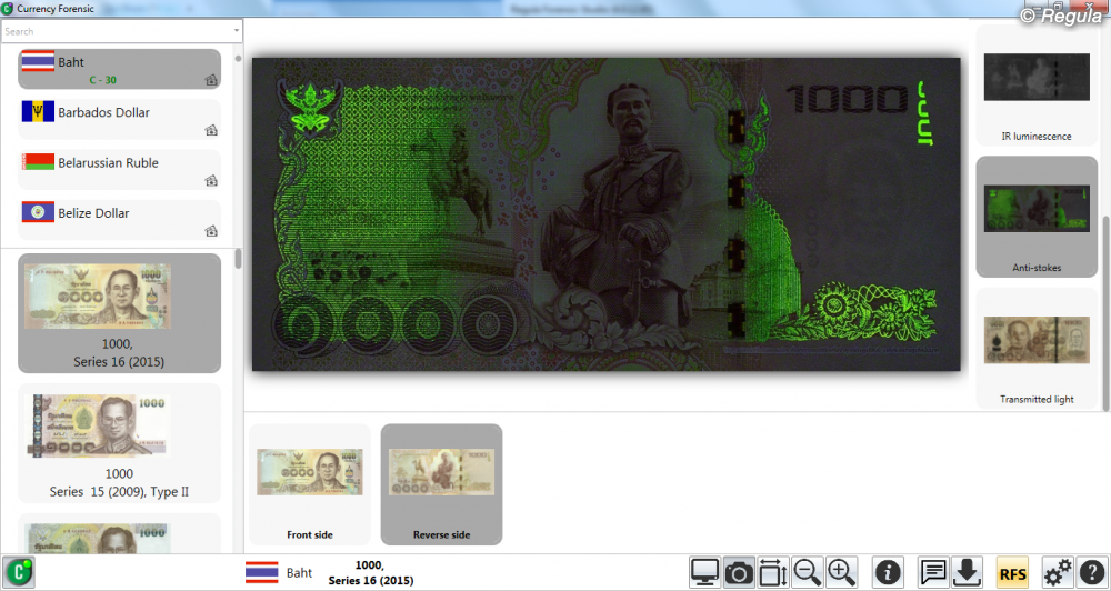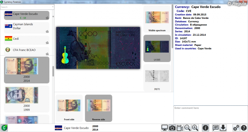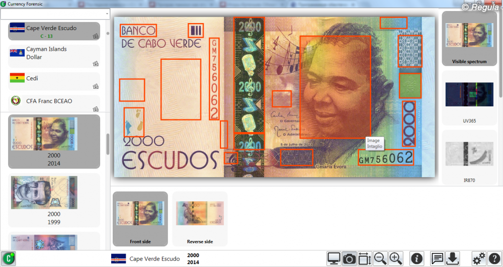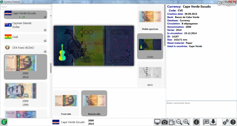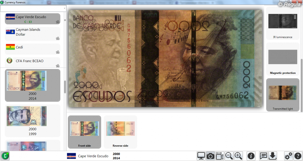 • Возможность выбора объема предоставляемой информации • Высокое качество изображений банкнот, их элементов и средств защиты • Наличие в версиях Forensic/Forensic Pro gif-анимации оптически переменных элементов защиты: голограмм, OVI-элементов • Быстрая и удобная система поиска • Возможность добавления: - собственных описаний и примечаний к существующим банкнотам - изображений и описаний новых банкнот с использованием программного модуля «Document Builder» в версии Forensic Pro • Интеграция с программным обеспечением «Regula Forensic Studio» для обработки изображений, сравнительного анализа: использование изображений банкнот и их фрагментов в качестве эталонных • Многоязыковой интерфейс: - английский - арабский - венгерский - испанский - итальянский - китайский - латышский - литовский - немецкий - польский - португальский - русский - украинский - французский - любой иной по требованию заказчика • Автоматическое обновление при наличии подключения к сети Интернет • Дистанционное обучение работе с системой • Дружественный интерфейс