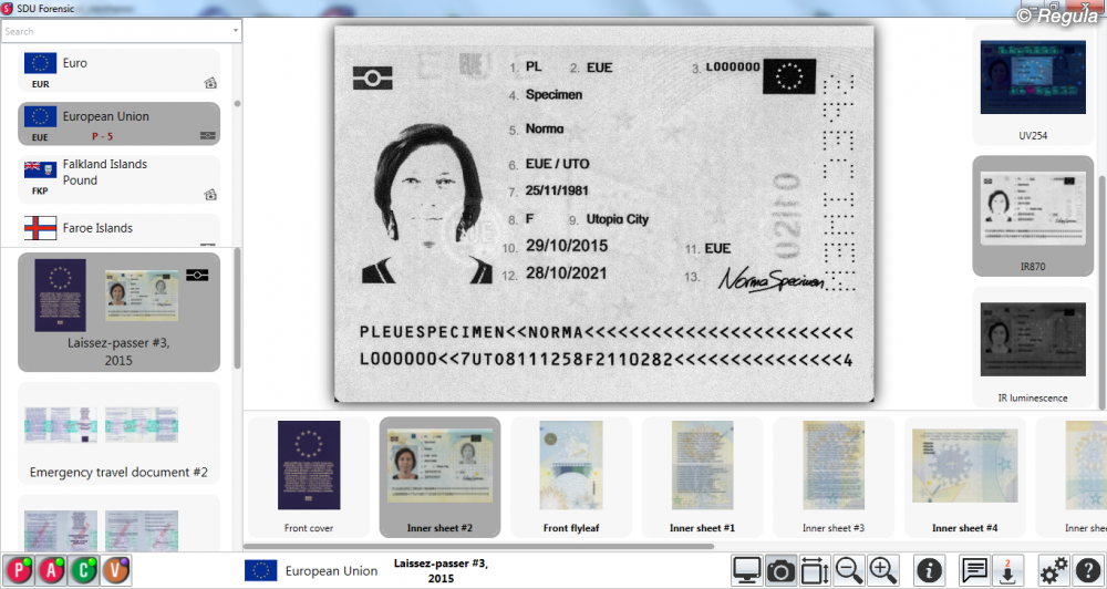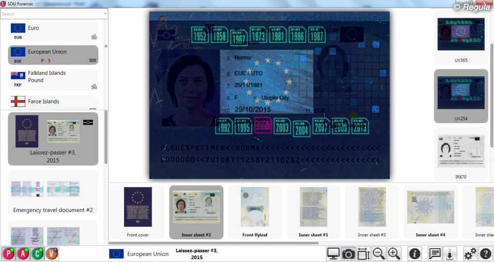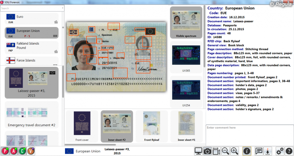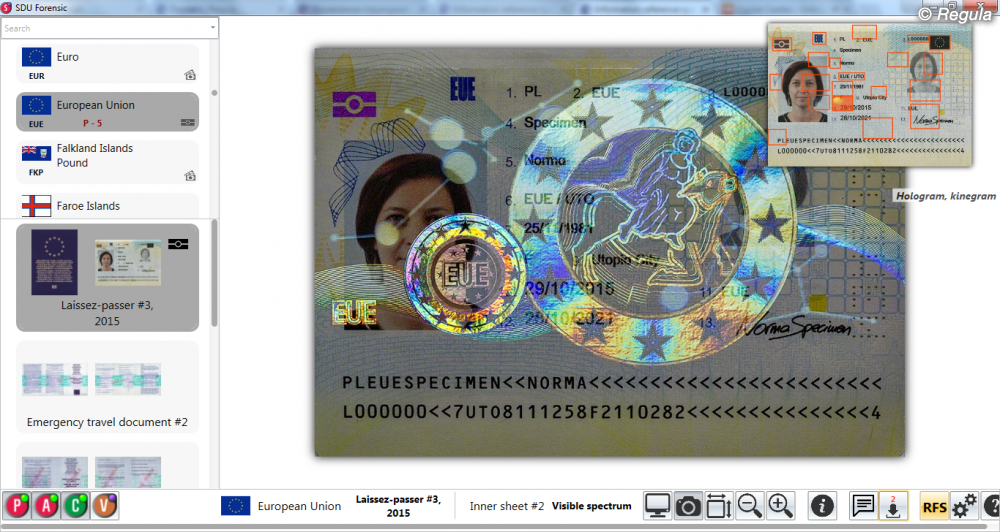 • Возможность выбора объема предоставляемой информации • Высокое качество изображений документов и банкнот, их элементов и средств защиты • Наличие в версиях Forensic/Forensic Pro gif-анимации оптически переменных элементов защиты: голограмм, OVI-элементов • Быстрая и удобная система поиска • Возможность добавления: - собственных описаний и примечаний к существующим документам и банкнотам - изображений и описаний новых документов и банкнот с использованием программного модуля «Document Builder» в версии Forensic Pro • Интеграция с программным обеспечением «Regula Forensic Studio» для обработки изображений, сравнительного анализа: использование изображений документов, банкнот и их фрагментов в качестве эталонных • Многоязыковой интерфейс: - английский - арабский - венгерский - испанский - итальянский - китайский - латышский - литовский - немецкий - польский - португальский - русский - украинский - французский - любой иной по требованию заказчика • Автоматическое обновление при наличии подключения к сети Интернет • Дистанционное обучение работе с системой • Дружественный интерфейс