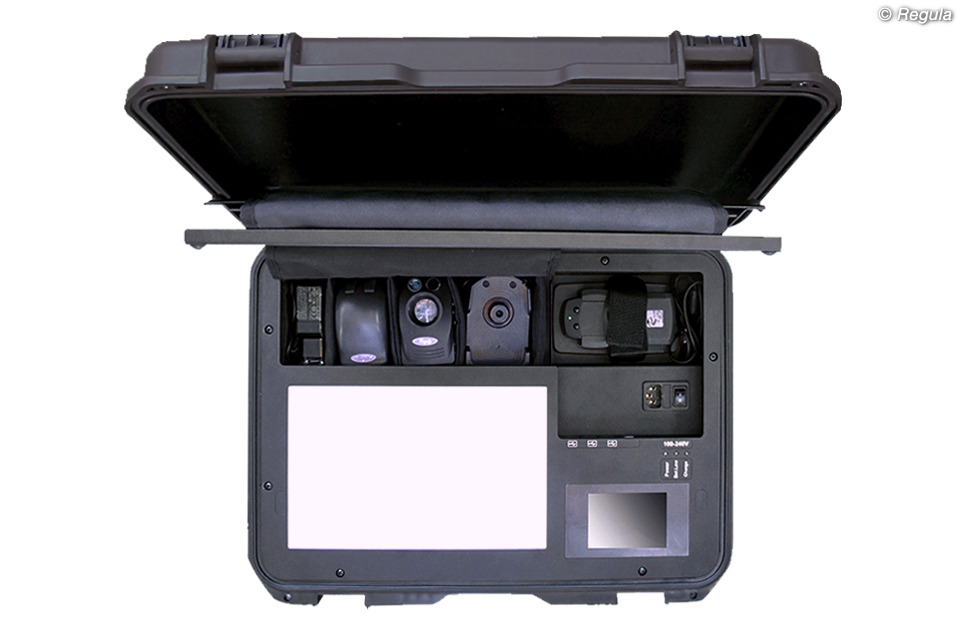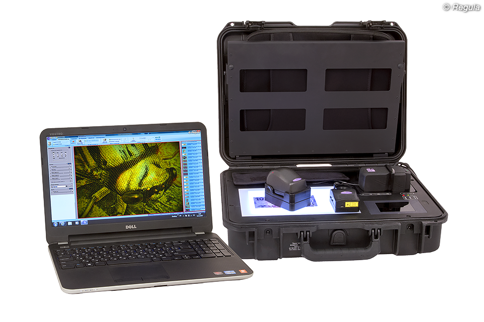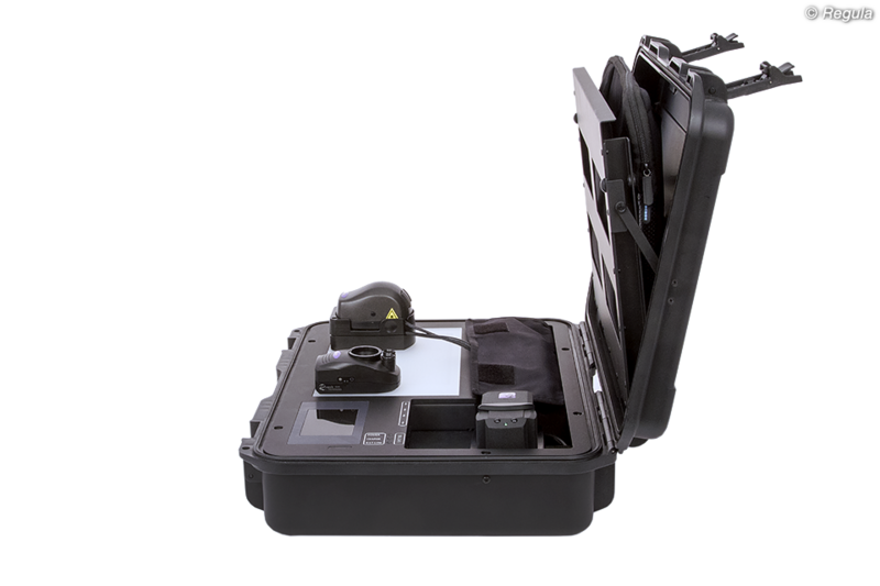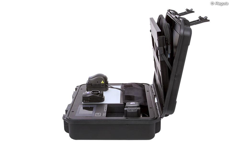 Мобильный комплекс в защитном кейсе. Состоит из портативного персонального компьютера, модель которого согласуется с заказчиком; двух предметных столов с просветными экранами и лупы спектральной люминесцентной «Регула» 4177 с оптическим модулем «Регула» 4178, работающими под управлением программного обеспечения «Regula Forensic Studio»; прибора компактного «Регула» 1025. Используется в мобильном (питание от внутреннего аккумулятора) и стационарном (питание от сети переменного тока) вариантах. Опционально комплектуется визуализатором магнитных свойств документов «Регула» 4197и информационно-справочными системами.