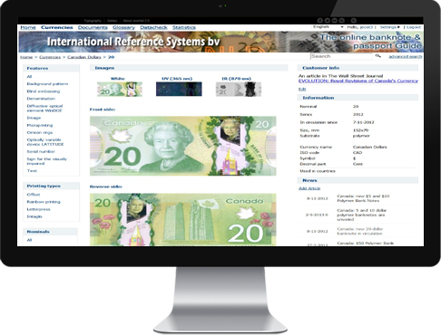 • Еженедельный бюллетень с информацией о: - новых банкнотах; - больше не действительных платежных средствах и других событиях. • Обширная информация обо всех функциях безопасности банкнот. • Специальные поисковые средства для быстрого поиска банкноты, на основе имени, кода ISO, периода, функции безопасности, основы, размера и т.д. • Узнайте, какие банкноты в настоящее время находятся в обращении, а какие нет. • Подробная информация о безопасности: - водяной знак; - микропечать; - защитная пленка; - защитная нить; - УФ-реакция; - глубокие и антикопирующие детали, такие как голограммы и кинеграммы. • Онлайн-тренинг по проверке банкнот. • Информация доступна на 7 языках: английском, немецком, французском, итальянском, испанском, русском и голландском (могут быть предложены и другие языки). • Дополнительная информация, например: - Ограничения на импорт / экспорт - Альтернативные валюты - Советы путешественникам