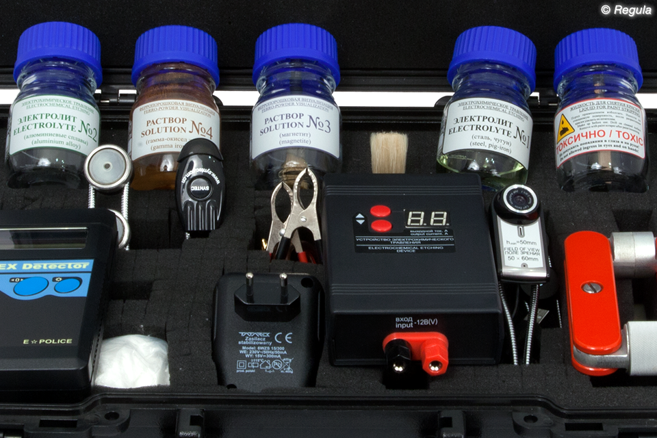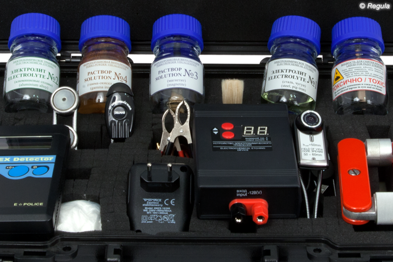 1. Устройство магнитопорошковой визуализации: выносной намагничиватель с изменяемой геометрией магнитопровода и оперативный запас ферропорошковых растворов — визуализация структурных и рельефных неоднородностей материала: зон наклепных напряжений и локальных термических воздействий, ферромагнитных материалов, сварных швов, поверхностных дефектов без снятия лакокрасочного покрытия: • возбуждение магнитных полей рассеяния над поверхностью объекта, отображающих внутренние структурные неоднородности материала • магнитопорошковая визуализация магнитных полей рассеяния объекта 2. Устройство вихретокового детектирования: выносной вихретоковый датчик и измерительно-индикаторное устройство — индикация структурных неоднородностей материала: сварных швов, изменений толщины металла и слоя лакокрасочного покрытия, зоны локальных термических воздействий без снятия лакокрасочного покрытия: • возбуждение электромагнитного поля вихревых токов в исследуемой области объекта, отображающих внутренние структурные неоднородности материала и геометрические параметры объекта • индикация параметров взаимодействия электромагнитного поля вихревых токов и электромагнитного поля возбуждения 3. Устройство электрохимического травления: выносная гальваническая головка травления с регулятором тока и инвертор напряжения — визуализация структурных неоднородностей материала: зон наклепных напряжений и локальных термических воздействий, сварных швов со снятием лакокрасочного покрытия: • снятие лакокрасочного покрытия • электрохимическое травление поверхности металлических образцов, изготовленных из стали, чугуна и алюминиевых сплавов • бесконтактная заправка, травление, обслуживание гальванической головки 4. Оптический зонд с источником косопадающего света, который выполнен на базе цветной USB-камеры и снабжен гибким штативом с магнитными фиксаторами — визуально-оптические исследования лицевой и тыльной поверхностей номерных площадок: отображение рельефа поверхности; ввод изображений, полученных при визуализации методами магнитопорошкового исследования и электрохимического травления: • освещение объекта исследования • получение изображения исследуемого объекта и преобразования этого изображения в телевизионный сигнал • формирование телевизионного изображения на экране монитора • сохранение результатов исследований 5. Кейс укладки — размещение периферийных устройств для хранения и транспортировки
