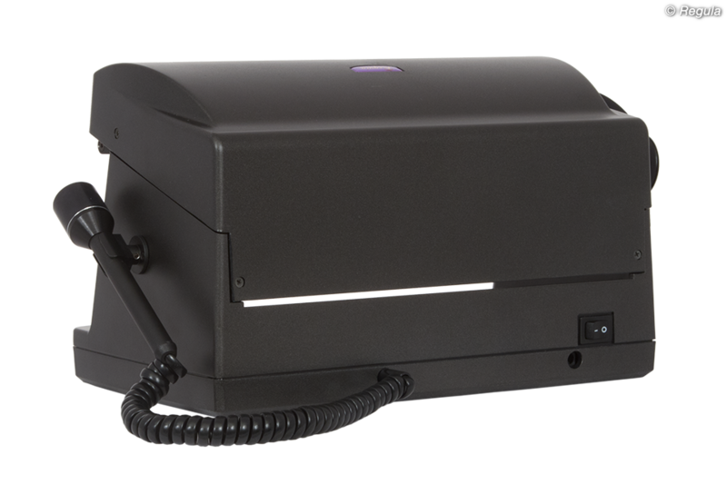 Модель в виде малогабаритного блока. Корпус из пластмассы. Переключатели источников света для различных режимов исследования расположены на плоскости предметного стола с просветным экраном. На просветный экран нанесена шкала для оценки величины исследуемых объектов. Конструкция позволяет установить лупу «Регула» 100Х с увеличением 10 крат и наружный осветитель.